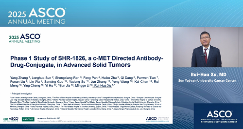 2025年美国临床肿瘤学会(ASCO)年会于5月30日至6月3日在美国芝加哥举行。本次大会,由中山大学肿瘤防治中心徐瑞华教授牵头、PG自主研发的靶向细胞间质上皮转换因子(c-MET)ADC药物SHR-1826的一项I期临床研究入选临床科学研讨会,并由徐瑞华教授口头报告了该研究结果。该研究由43家国内中心共同完成。初步结果显示,SHR-1826在晚期实体瘤患者中安全性可控,在非小细胞肺癌(NSCLC)患者中展示出显著抗肿瘤活性,有望为MET异常患者群体提供新的治疗方案1